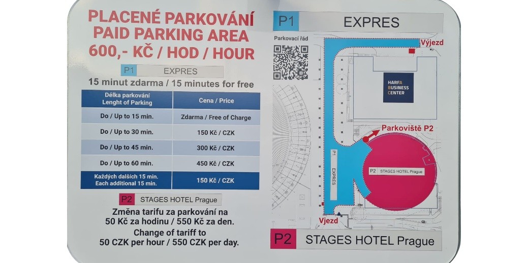 - Cena parkování je 50 CZK za každou započatou hodinu (platba v automatu v garážích).